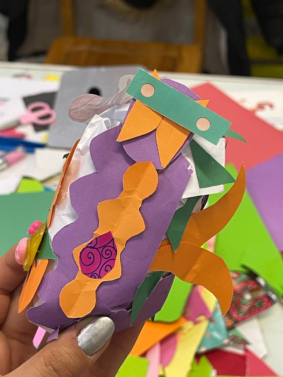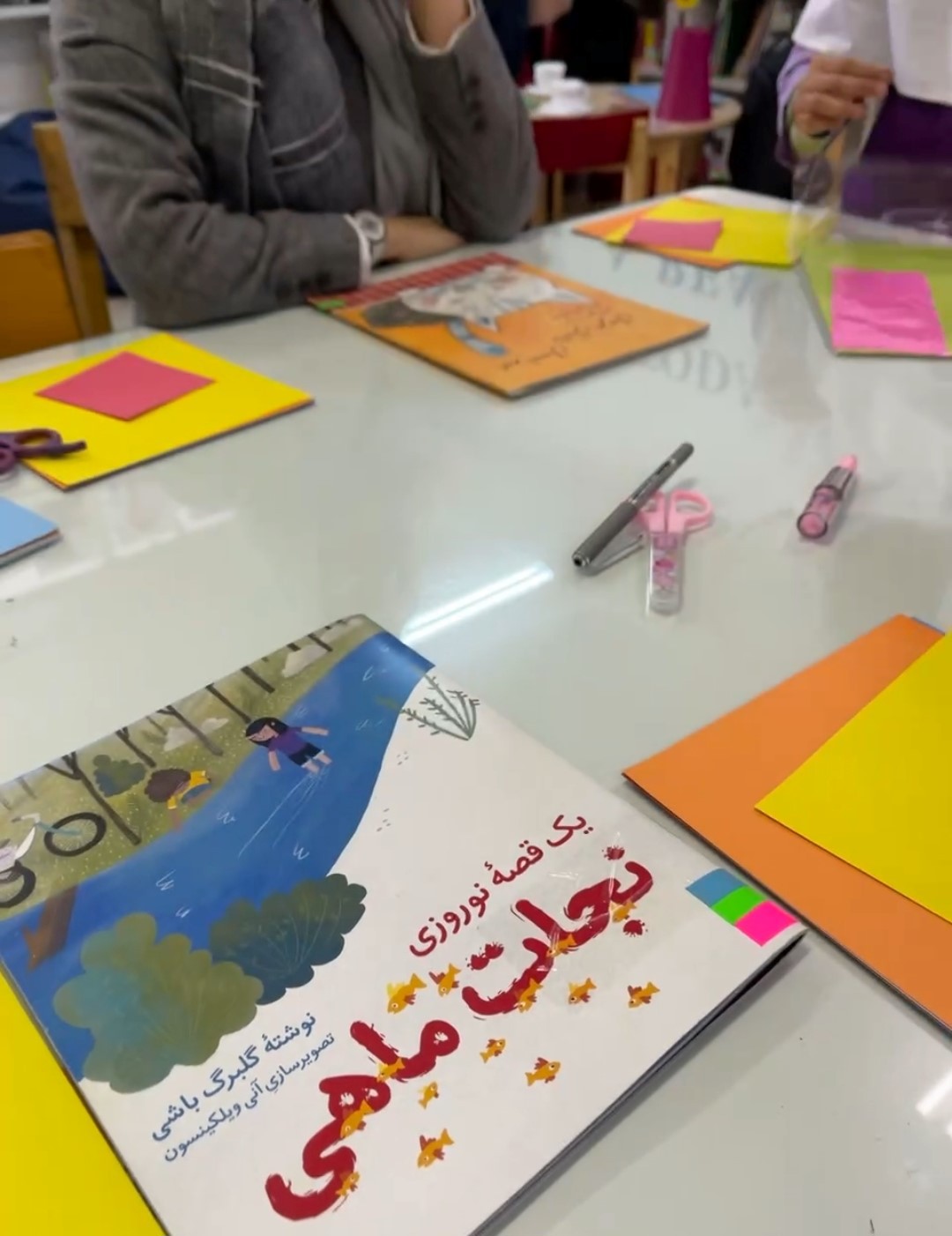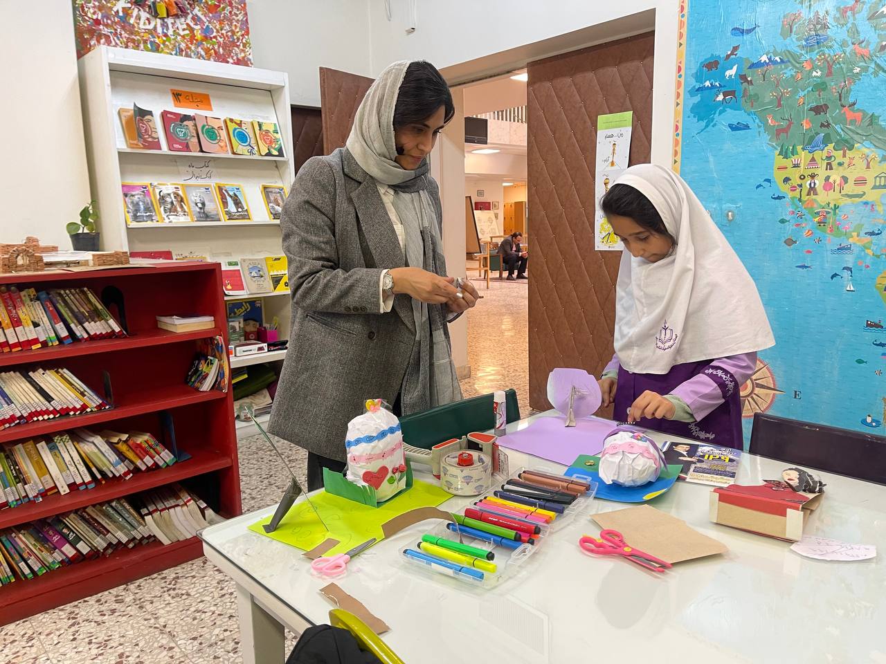 The workshop was the fifth session of a series of collage workshops which focused on story reading. In this workshop, a story named "A Nowruz Story: Saving the Fish" written by Golbarg Bashi was read aloud. Also symbols of Haft-Sin tablecloth were talked about. After that, with waste and also colored papers, different items of Haft-Sin in different sizes were made. The workshop was facilitated by Mahboubeh Latifi and Somayeh Soleimani, librarians of the children and adolescent’s unit of the Central Library.